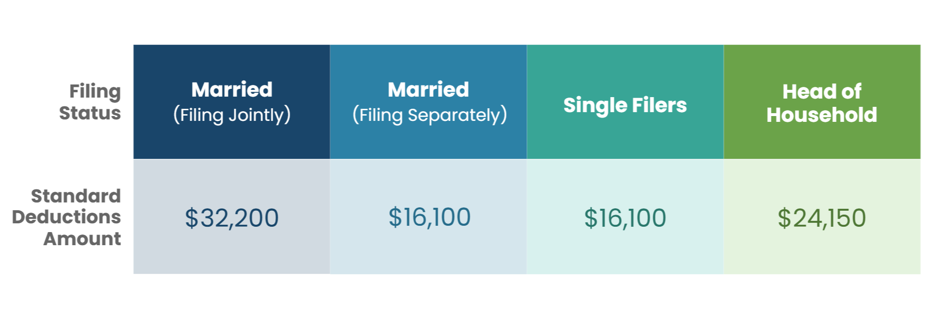 From adjusted gross income, deductions are subtracted. With deductions, taxpayers have two choices: the standard deduction or itemized deductions. The standard deduction amount varies based on filing status, as shown on this chart: